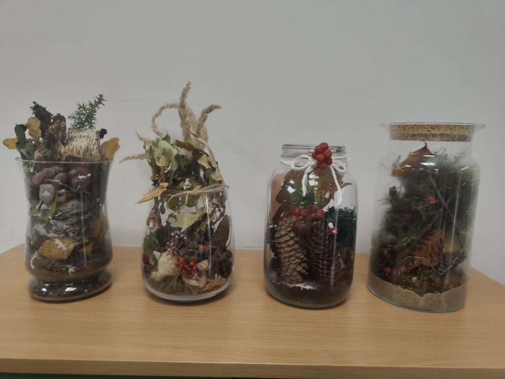 Dzieci z zaangażowaniem dobierały rośliny, układały warstwy ziemi i kamyczków, a przy tym uczyły się o obiegu wody w przyrodzie i trosce o środowisko. Efekty ich pracy są wspaniałe – każdy słoik to małe dzieło sztuki !